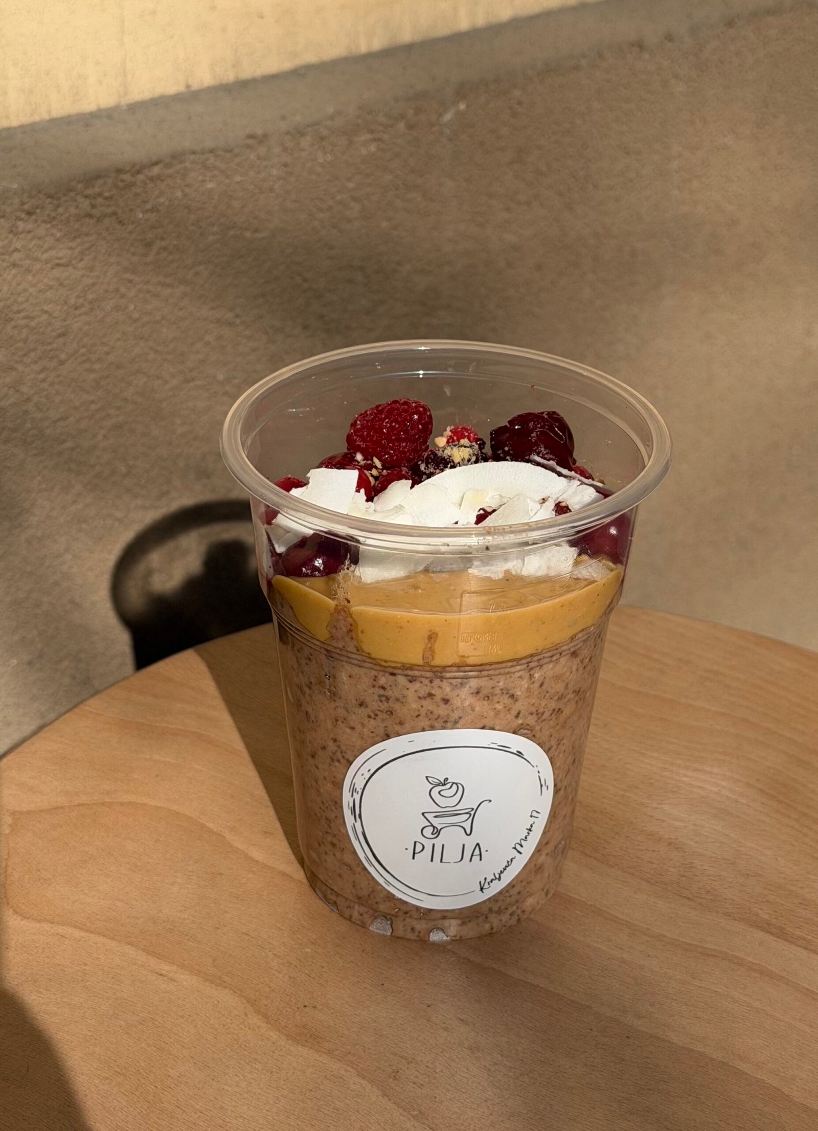 Fit ovsena kaša KIKI je kombinacija Pilja homemade ovsene kaše (lan, chia seme, ovsene pahuljice, lešnik i čokolada), Pilja kikiriki putera, kokosa, soja mleka i crvenog voća.